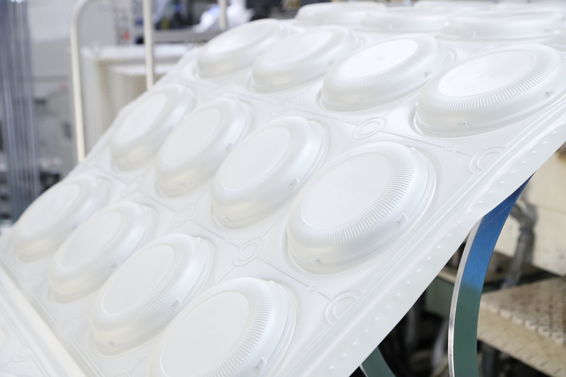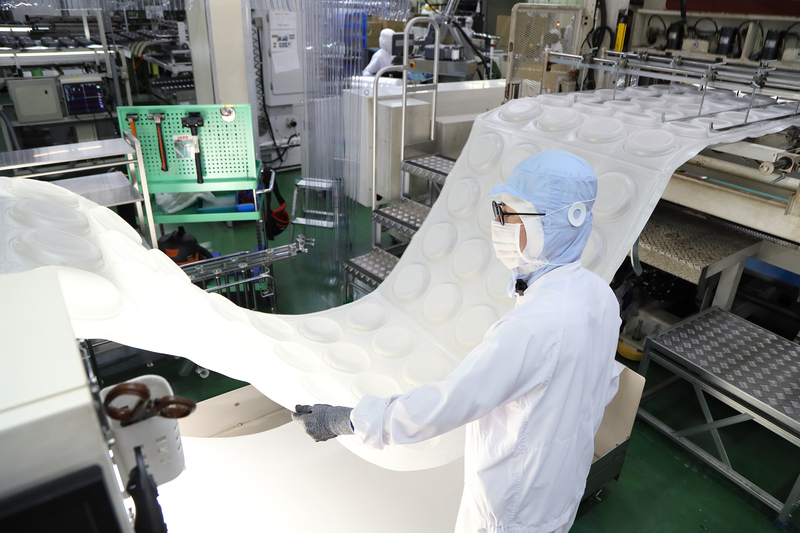 機械を動かし食品容器をつくる仕事をしています。品質の確認や不良の調整をはじめ、扱う製品の種類が変わるごとに金型交換や抜型交換などの段取り作業もします。機械整備や職場の改善活動、新人教育なども担当しています。