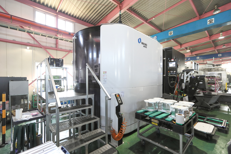 大きな機械(マシニングセンター)を使用してアルミ素材の加工を行っ